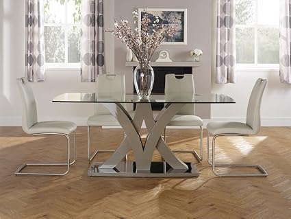 Mesa con tope en cristal templado, perfiles en acero inoxidable y sillas con base en acero inoxidable Elegancia, sencillez y confort.